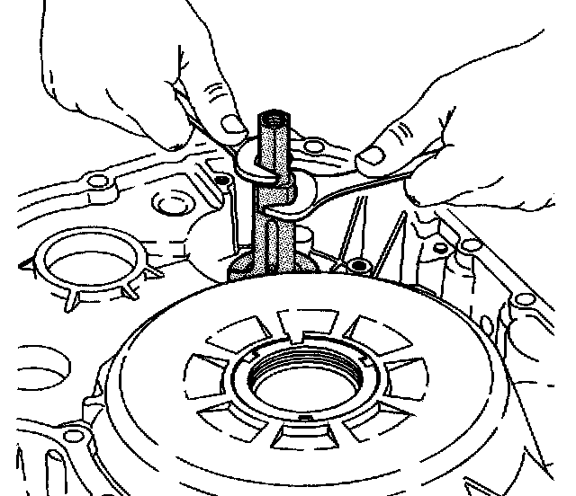 15. Using a wrench, the J 45124, the J 45191 or the J 45114, remove the front differential carrier bearing cup from the torque converter and differential housing assembly.