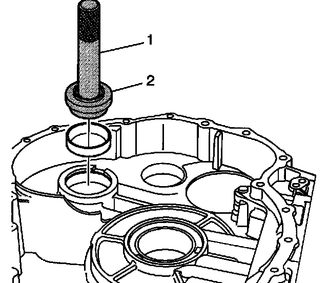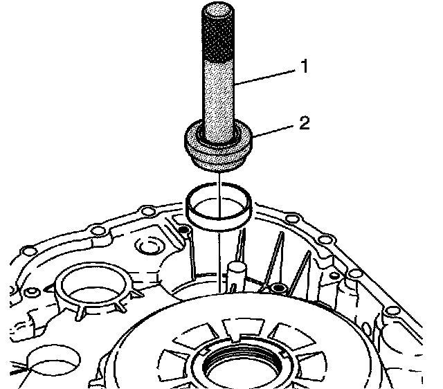 20. Using the J 8092 (1), the J 43076 (2) or the J 44719 (2) and a hammer, install the front differential carrier bearing cup into the torque converter and differential housing assembly.