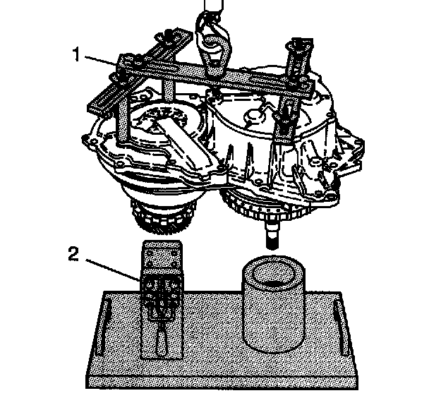 8. Lower the case cover assembly, with forward clutch and input shaft, into the J44337 (2).