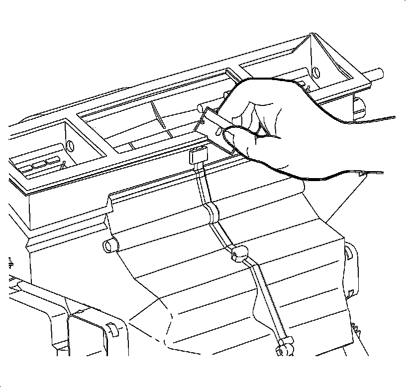 14. Install recirculation door rod to small door. With both doors held firmly closed, snap rod into retainer clip and close the clip.