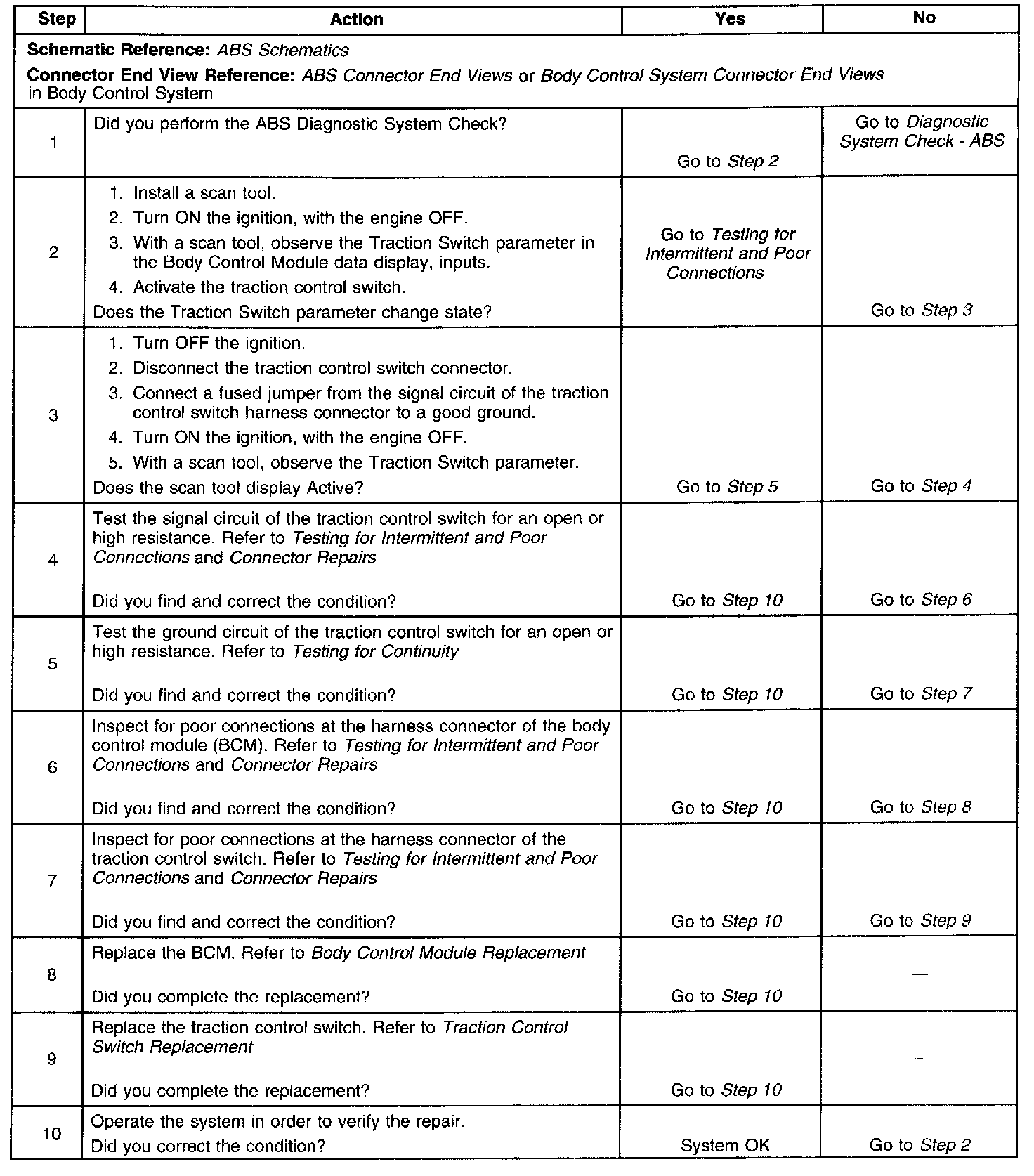 The TRAC OFF indicator is controlled by the instrument cluster via class 2 serial data messages from the Electronic Brake Control Module (EBCM). When the Body Control Module (BCM) sees the traction control switch input grounded through the momentary traction control switch, it sends a class 2 message to the EBCM that tells the EBCM that the traction control switch has been pressed. The EBCM then disables traction control and sends a message to the instrument cluster to turn the TRAC OFF indicator ON. Each time the ignition is cycled from OFF to ON, the traction control system is enabled.