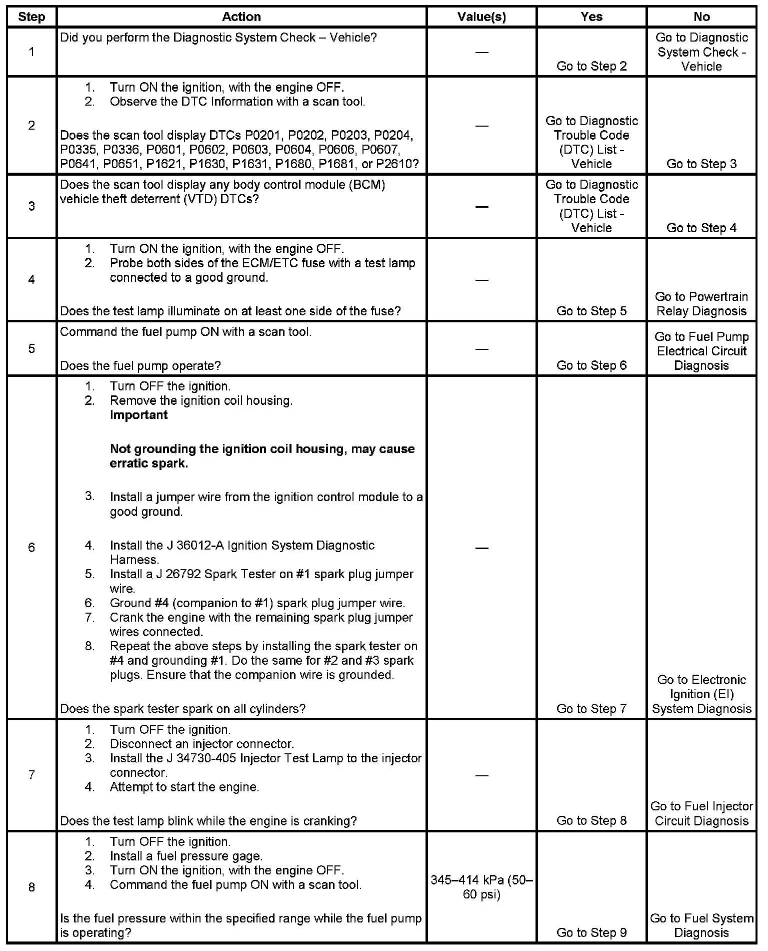 The Engine Cranks but Does Not Run diagnostic table is an organized approach to identifying a condition that causes an engine not to start. The Engine Cranks but Does Not Run diagnostic table directs the service technician to the appropriate system diagnosis.