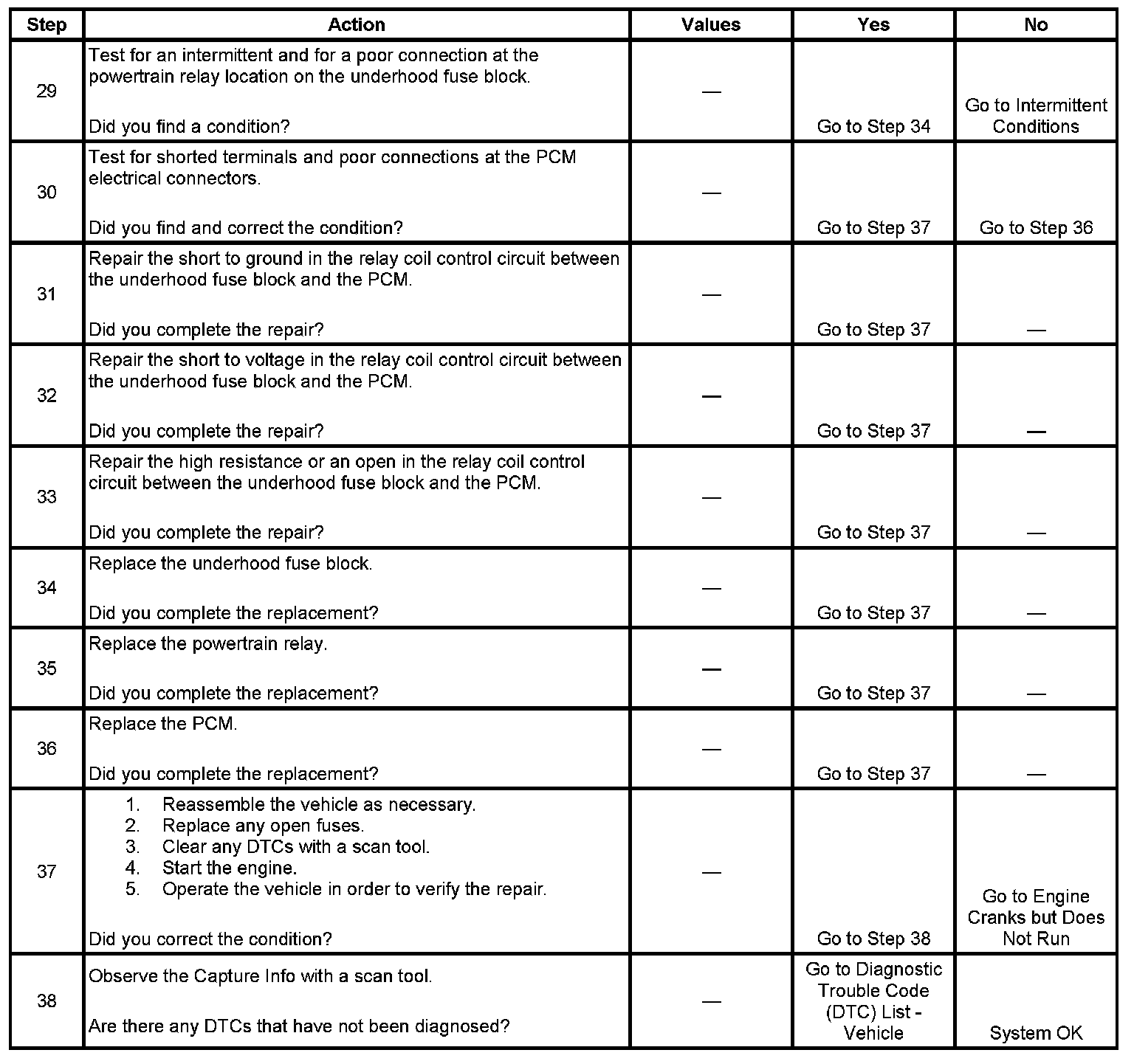 If the powertrain relay fails to close, the engine will crank but will not run. The class 2 communications will be available with the use of a scan tool.