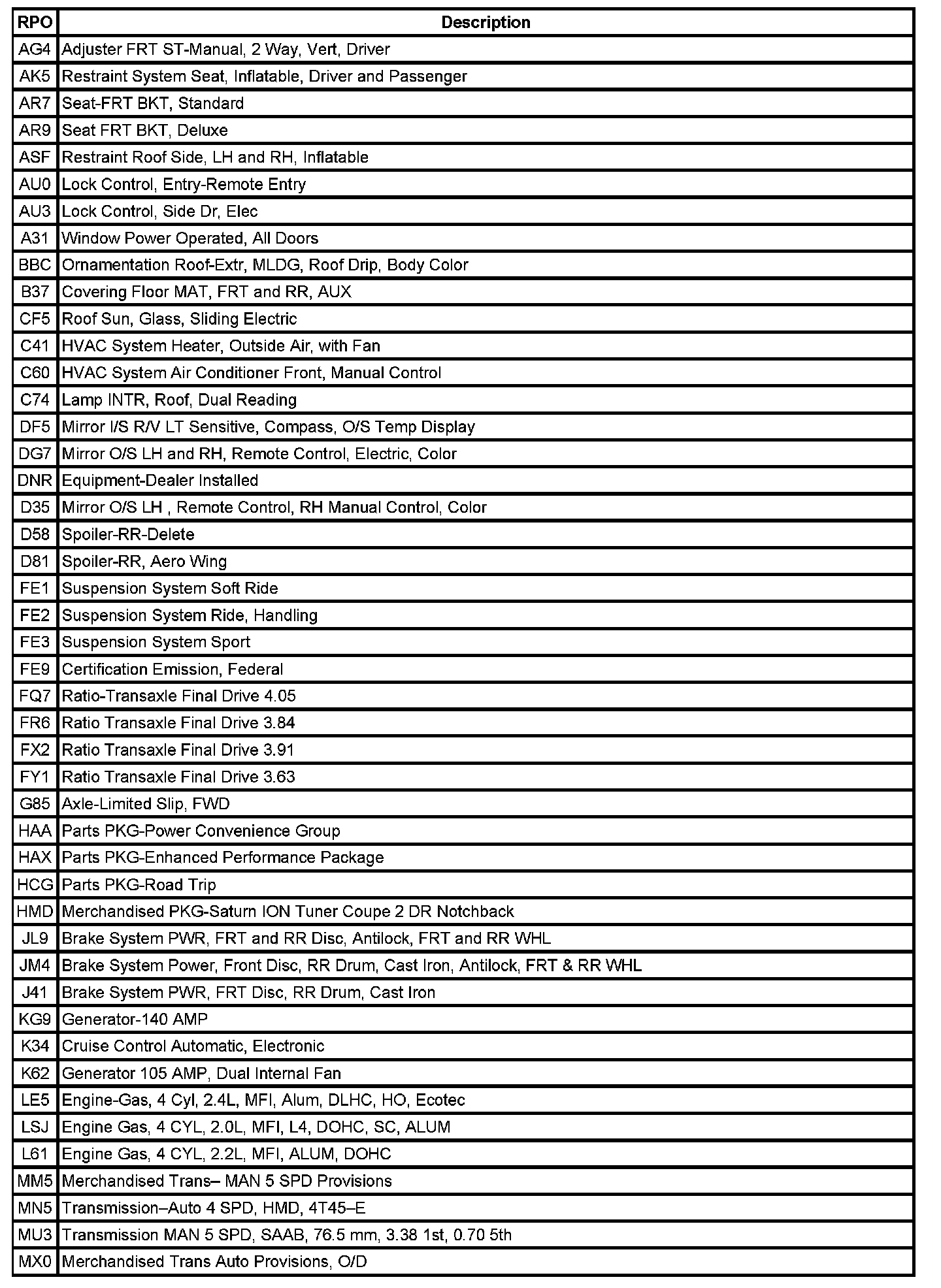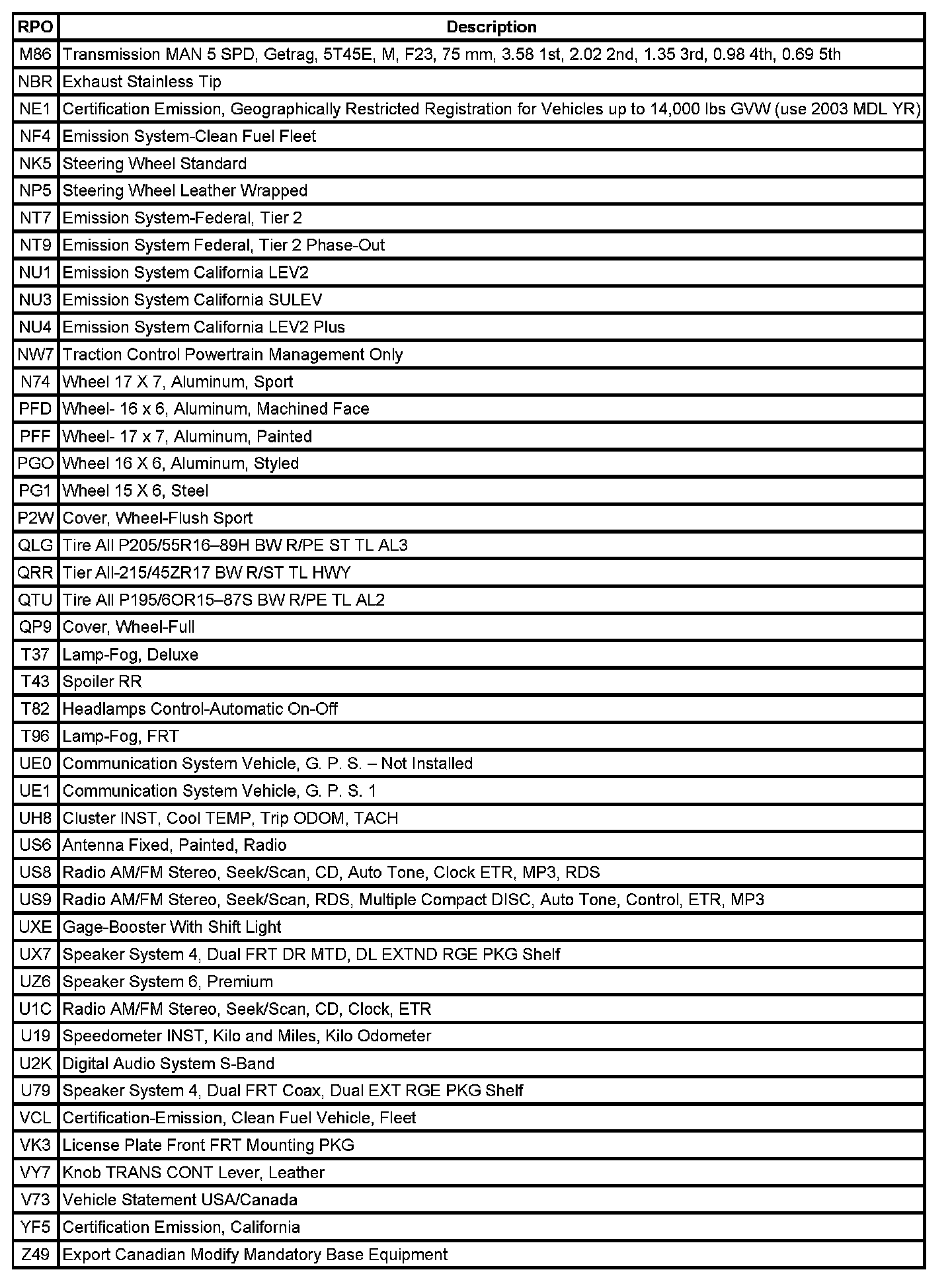 The table provides the description of the Regular Production Option (RPO) codes that are available on the vehicle. The vehicle RPO list is printed on the Service Parts Identification Label.