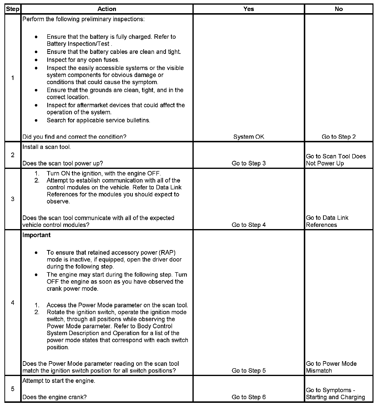 4. A module that is operating in the incorrect power mode based on key position may cause other vehicle symptoms and/or DTCs to set. The information in Power Mode Mismatch will correct the condition before checking for module DTCs or symptoms.