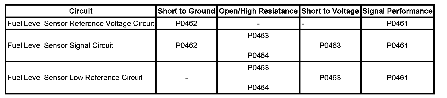 The fuel level sensor changes resistance in response to the fuel level. The engine control module (ECM) monitors the signal circuit of the fuel level sensor in order to determine the fuel level. When the fuel tank is full, the sensor resistance is low and the ECM senses a low signal voltage. When the fuel tank is empty, the sensor resistance is high and the ECM senses a high signal voltage. The ECM uses the signal circuit of the fuel level sensor in order to calculate the percentage of remaining fuel in the tank. The ECM sends the fuel level percentage via the serial data circuit to the body control module (BCM). The BCM sends the fuel information to the instrument panel cluster via the serial data circuit in order to control the fuel gage and display the fuel level.
