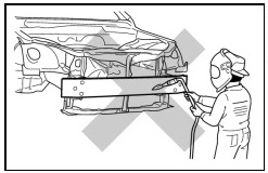 a. Rustproof high strength steel sheets are used for the body frame. Therefore, if these parts are heat repaired using an acetylene torch or equivalent, the crystalline structure changes, causing the strength of the steel sheets to decrease. Also, the zinc coating which is used to protect the body from rust will be damaged. This causes the surface of the steel sheets to become oxidized, which reduces their ability to resist rust.