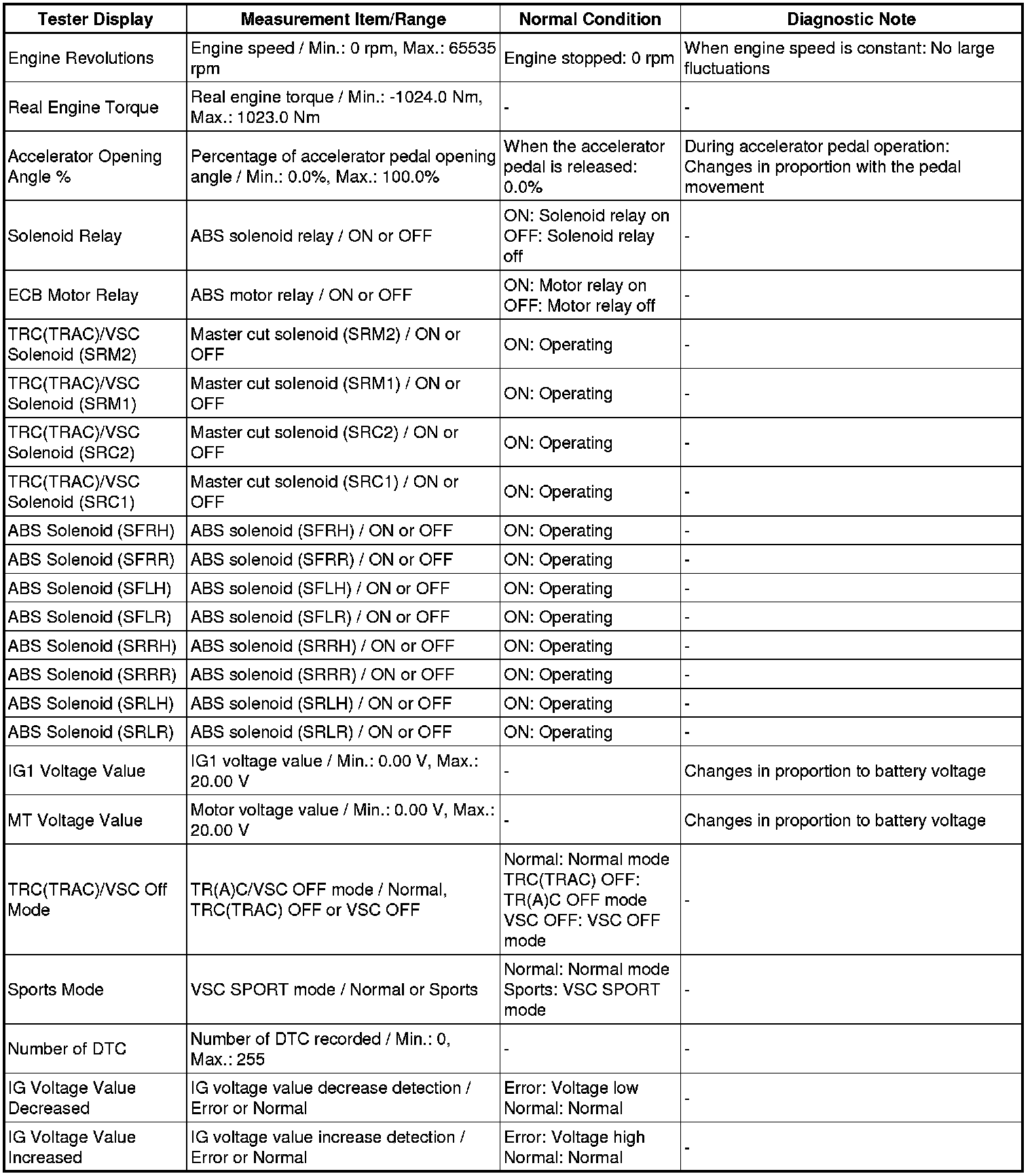 Using the Techstream to read the Data List allows the values or states of switches, sensors, actuators and other items to read without removing any parts. This non-intrusive inspection can be very useful because intermittent conditions or signals may be discovered before parts or wiring is disturbed. Reading the Data List information early in troubleshooting is one way to save diagnostic time.