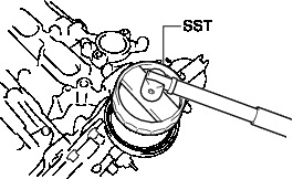 (a) Using a 24 mm deep socket wrench, remove the oil filter union.