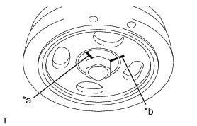 (f) Using a marker, draw the reference line (A) on the crank pulley bolt and also the reference line (B) on the crank pulley according to the line engraved around the crank pulley bolt head as shown in the illustration.