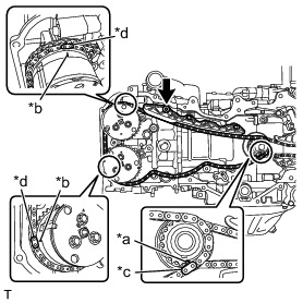 (c) Turn the crankshaft and align the alignment marks of the crankshaft timing gear or sprocket, camshaft timing intake gear assembly LH and camshaft timing exhaust gear assembly LH as shown in the illustration.
