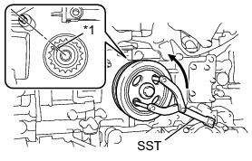 (e) Using SST, hold the crankshaft pulley and tighten the crank pulley bolt.