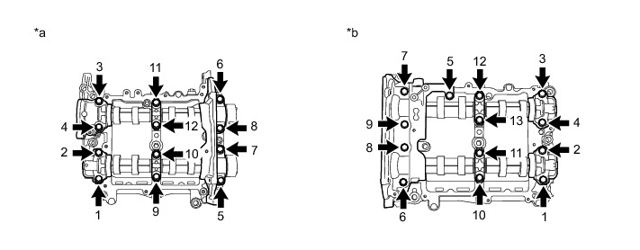 (e) Tighten the bolts in the order shown in the illustration to install the front camshaft cap, intake center camshaft cap, intake rear camshaft cap, exhaust center camshaft cap and exhaust rear camshaft cap.