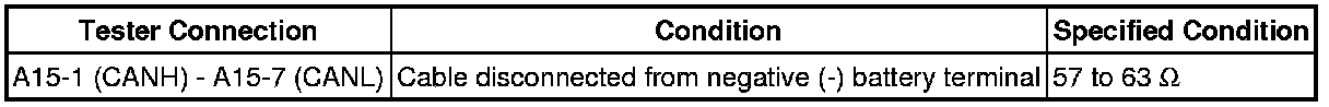 * Before measuring the resistance of the CAN bus, turn the ignition switch off and leave the vehicle for 1 minute or more without operating the key, switches or opening or closing the doors. After that, disconnect the cable from the negative (-) battery terminal and leave the vehicle for 1 minute or more before measuring the resistance.