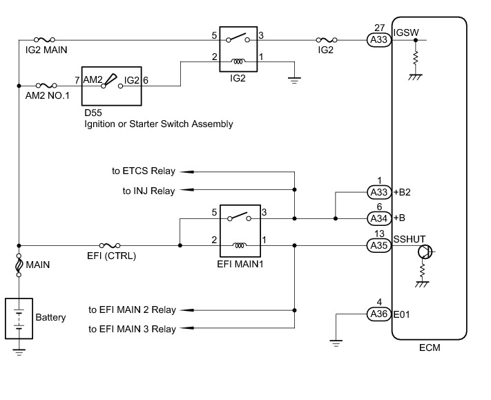 When the ignition switch is turned to ON, the IGSW signal is input into the ECM. This turns the internal transistor ON, causing the current to flow to the EFI MAIN1 relay coil, which closes the relay, supplying power to the ECM +B and +B2 terminals.