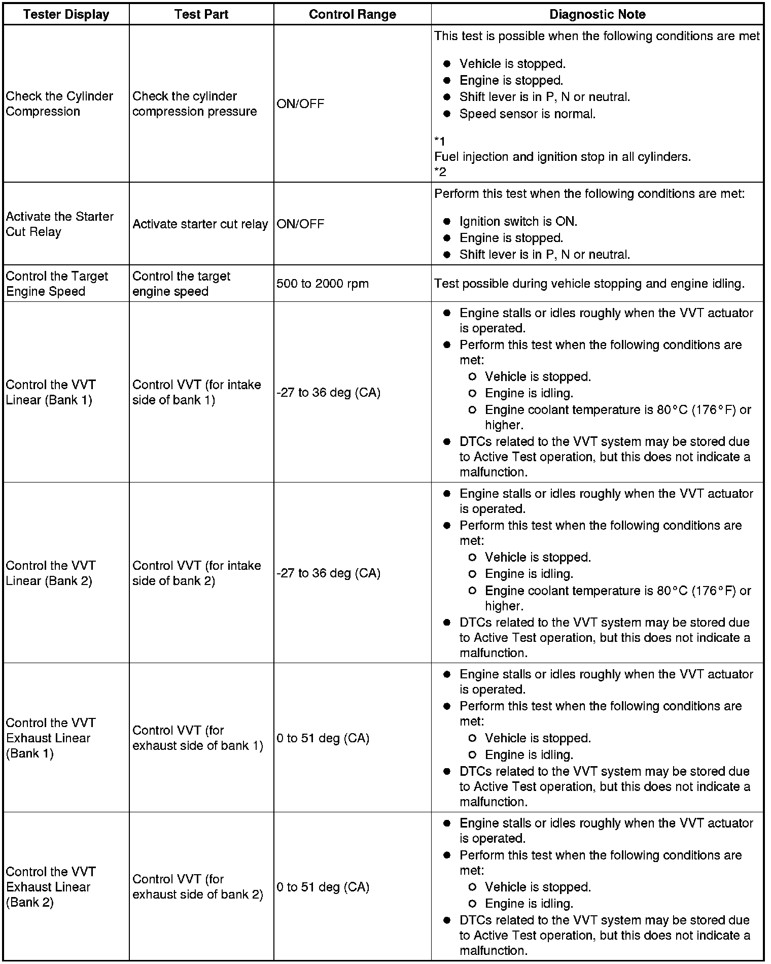 *2: When cranking the engine, each cylinder measures the engine speed. In this Active Test, the fuel and ignition of all cylinders is cut. The engine must then be cranked for approximately 10 seconds. At this time, the speed of each cylinder is measured. If the speed of one cylinder is more than the other cylinders, it can be determined that the compression pressure of that cylinder is lower than the other cylinders.