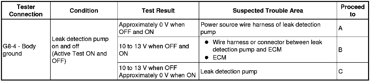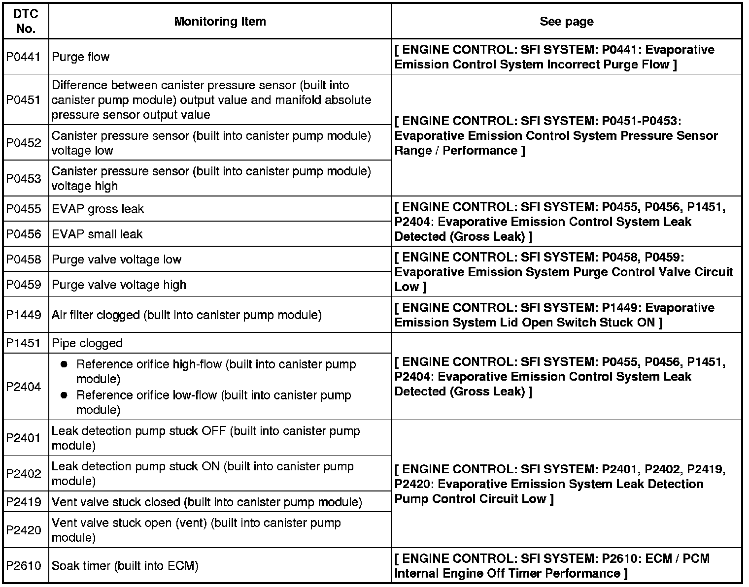 If any EVAP system DTCs are stored, the malfunctioning area can be determined using the table below.
