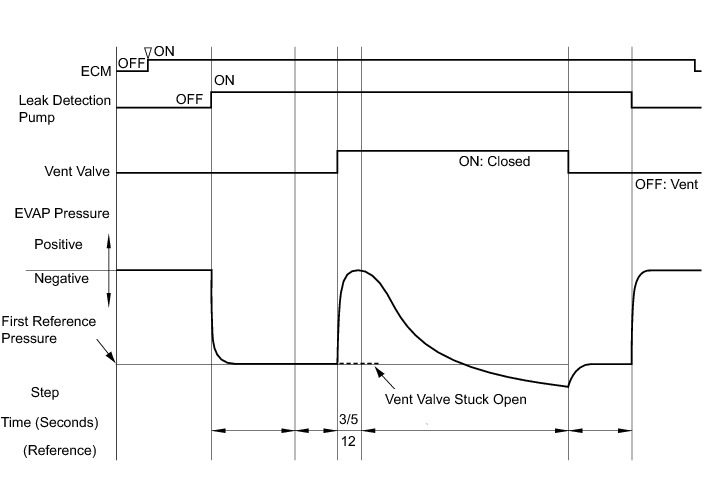 The vent valve is turned ON (closed) and the EVAP pressure is then measured. If the variation in the pressure is less than threshold, the ECM interprets this as the purge valve being stuck closed, and illuminates the MIL and stores DTC P0441 (2 trip detection logic).