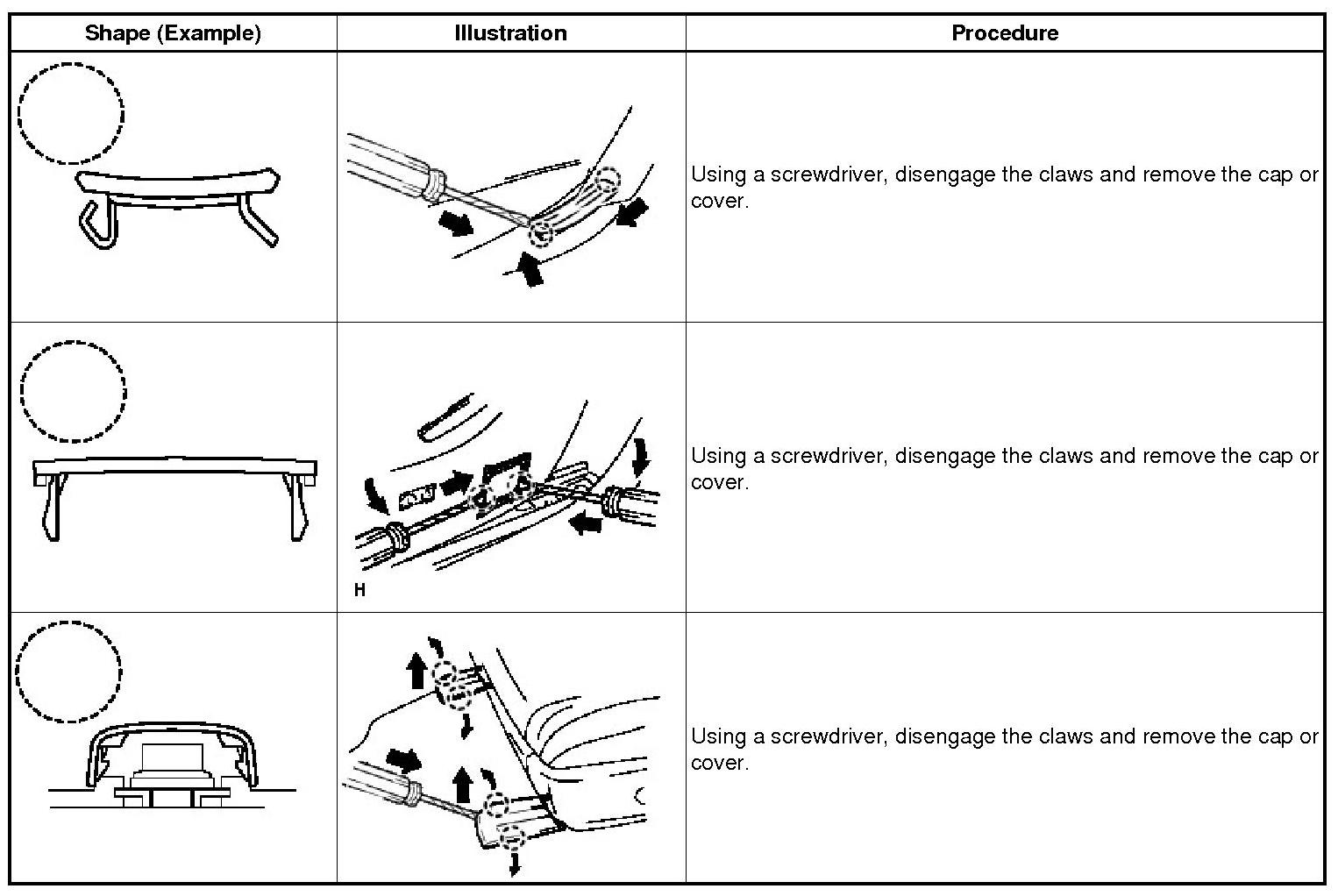 (1) The removal and installation methods of typical claws used for vehicle body parts are shown in the table below.