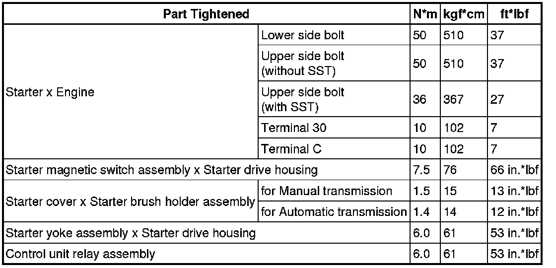 SPECIFICATIONS: FA20 STARTING: TORQUE SPECIFICATIONS; 2013 MY FR-S [03/2012 -]
