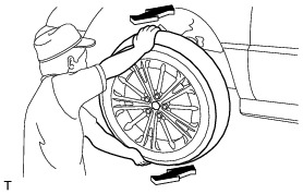 With the brake pedal depressed, attempt to move the top and bottom of the front tire in the axial direction, and confirm that there is no play.