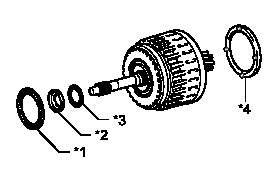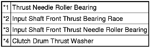 (b) Remove the clutch drum thrust washer, thrust needle roller bearing, input shaft front thrust bearing race and the input shaft front thrust needle roller bearing from the clutch drum and input shaft assembly.