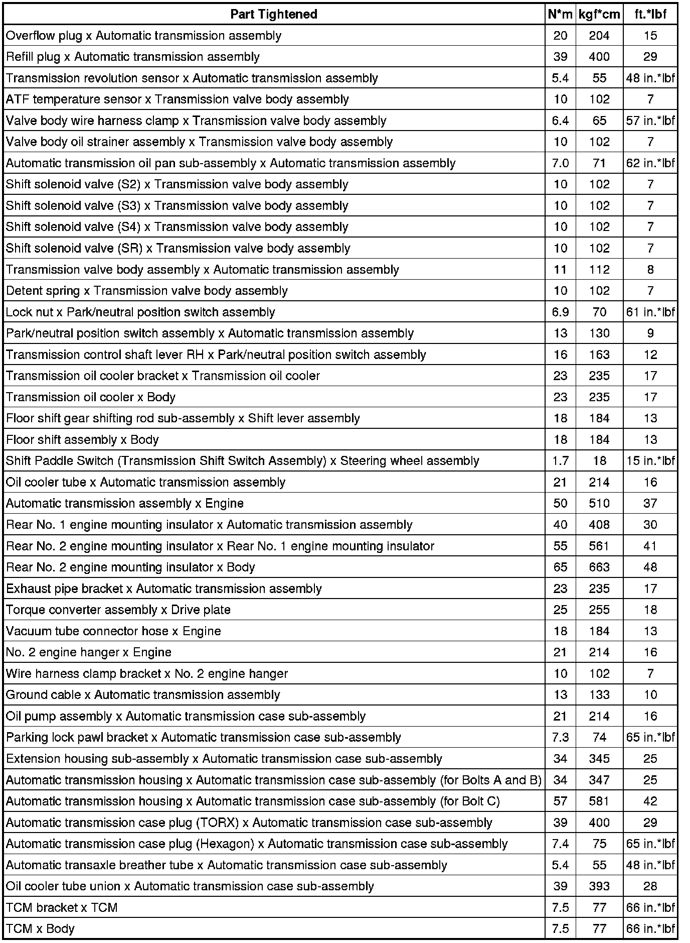 SPECIFICATIONS: TX6A AUTOMATIC TRANSMISSION / TRANSAXLE: TORQUE SPECIFICATIONS; 2013 MY FR-S [03/2012 -]