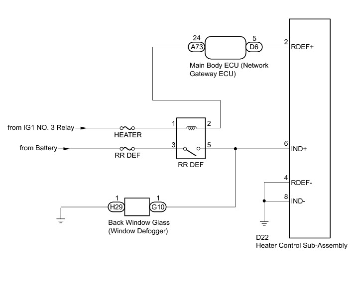 The rear window defogger control is performed by the main body ECU (network gateway computer). When the main body ECU (network gateway computer) receives an on signal from the rear window defogger switch, it operates the RR DEF relay for 15 minutes. Also, when the main body ECU (network gateway computer) receives an off signal from the rear window defogger switch within 15 minutes, it stops operation of the RR DEF relay.