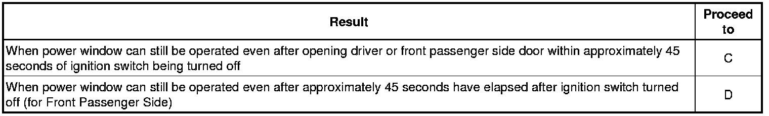 * When the driver or front passenger side door has not been opened, driver or front passenger side door power window regulator motor can control its power window operation for approximately 45 seconds after the ignition switch is turned from ON to off (the key is removed) by receiving operation permission signals from the main body ECU (network gateway ECU). However, when approximately 45 seconds have elapsed, or the driver or front passenger side door is opened within approximately 45 seconds after turning the ignition switch off (the key is removed), the power window regulator motor stops operating.