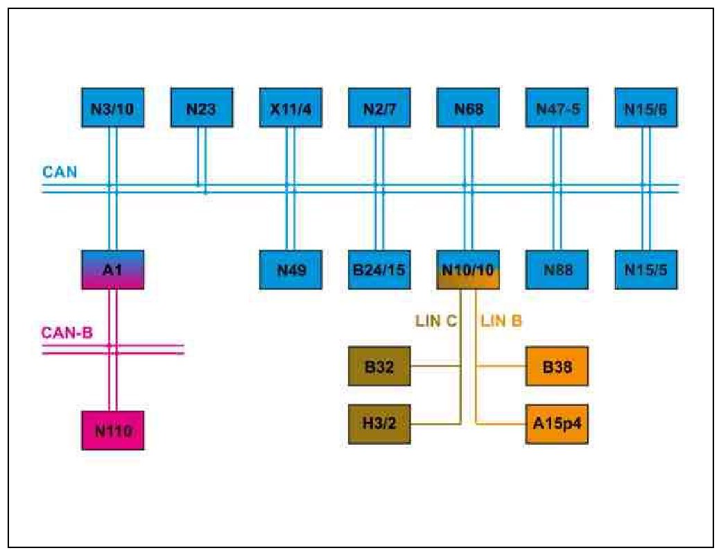 The CAN operates at a transfer rate of 500 kbit/s, CAN-B at a transfer rate of 83.3 kbit/s. The instrument cluster functions as a gateway between CAN and CAN-B.