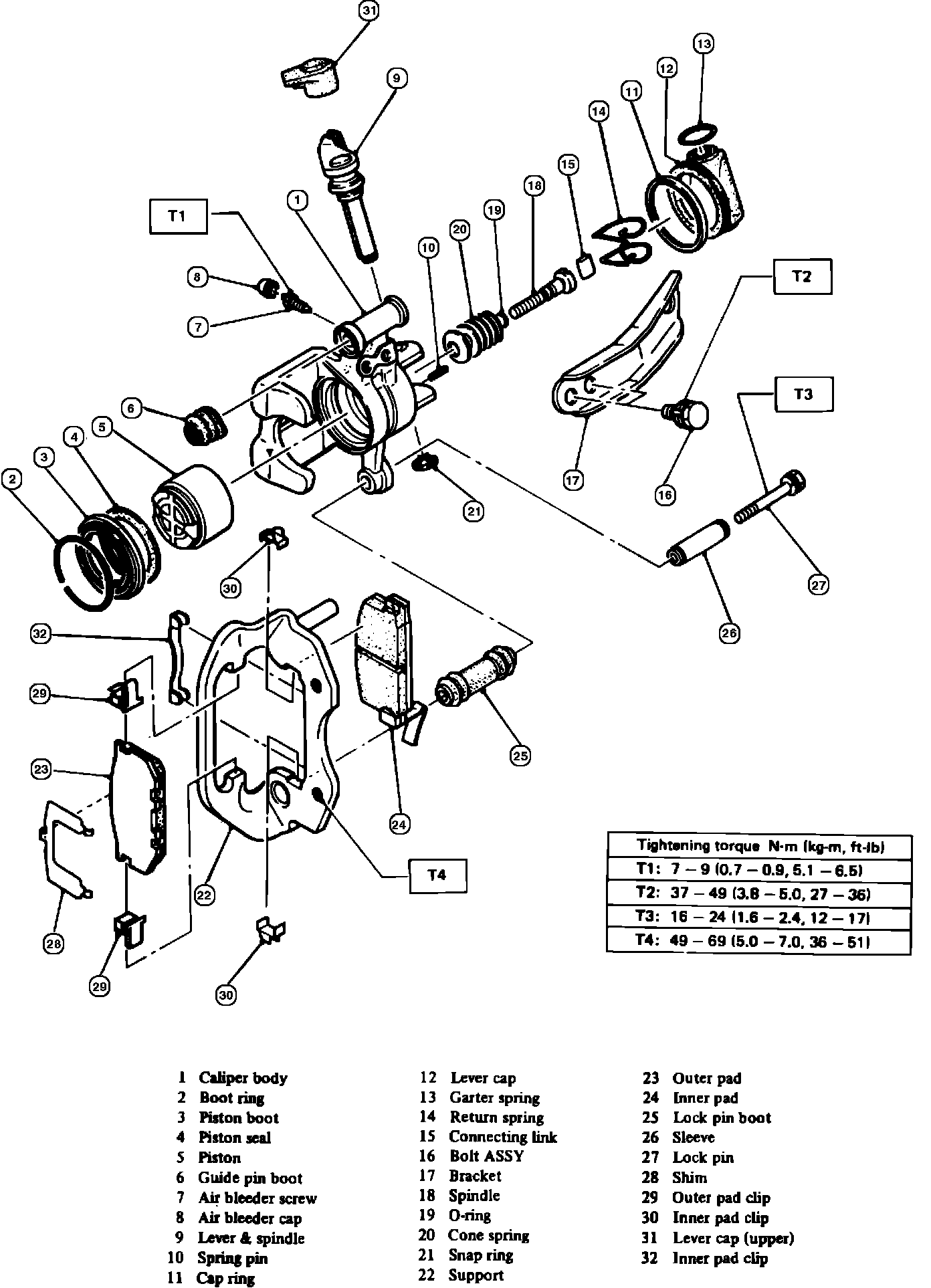 Fig. 1 Exploded view of front caliper assembly. 1984: