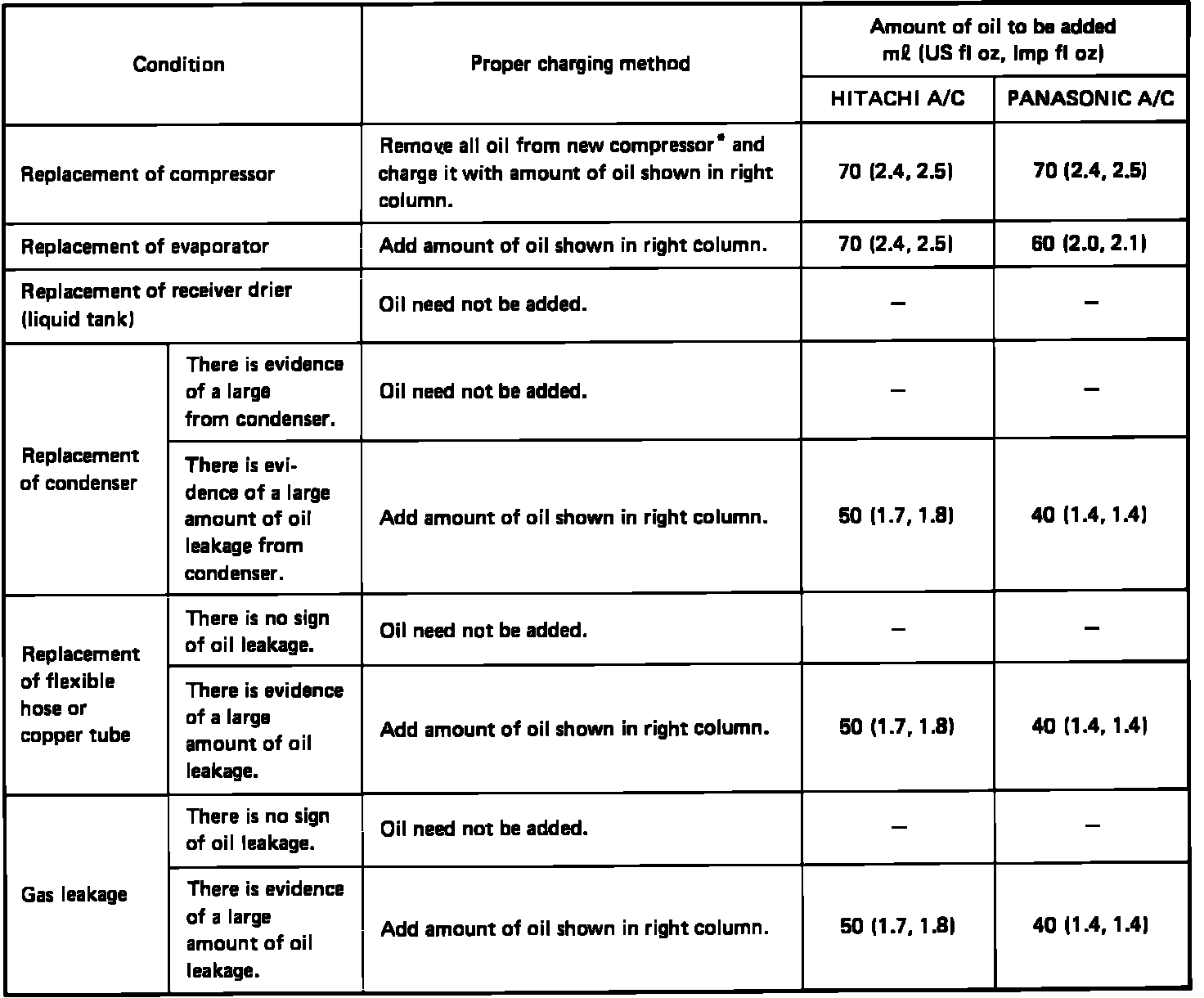 Oil Charge Table: