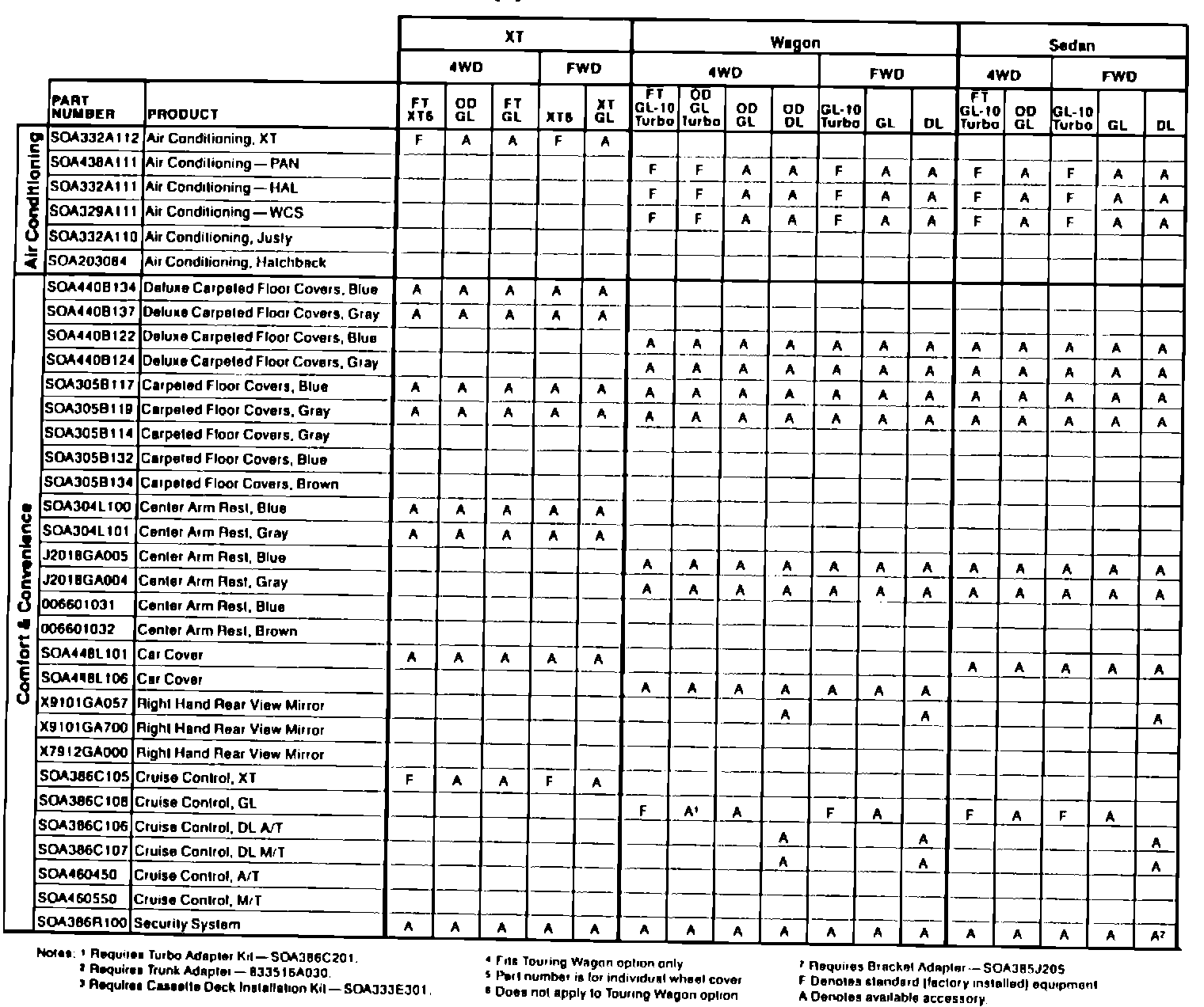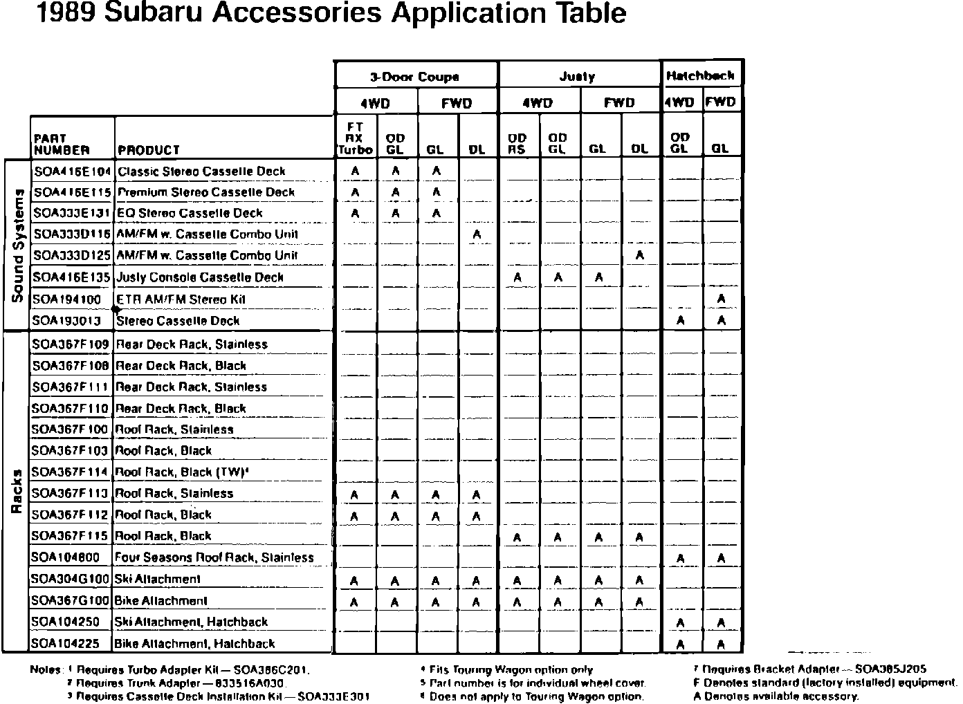 1989 Subaru Accessories Application Table