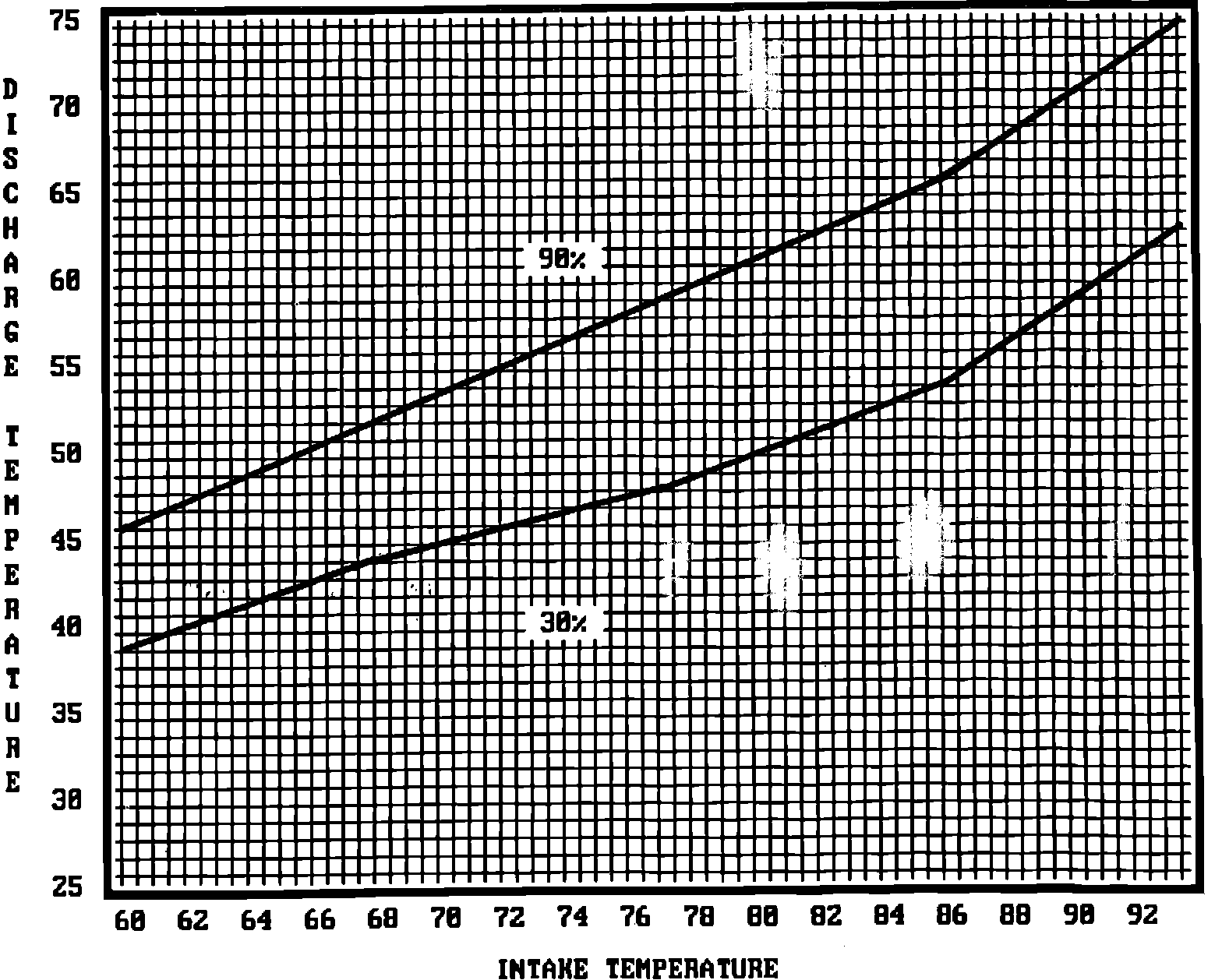 First, measure the intake air temperature as close to the recirculation inlet as possible. Second, measure the discharge air temperature at the center vent outlet, then compare against chart: 1) bottom graph line for 30% humidity; 2) upper line for 90% humidity.