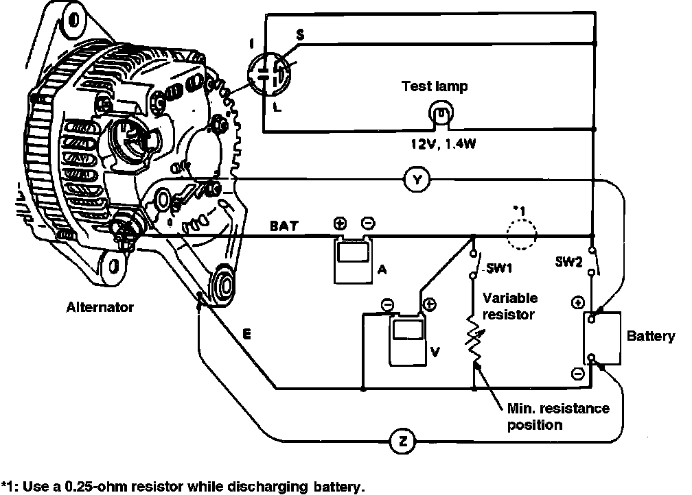 Mount alternator securely in a suitable test stand prior to testing. Ensure test stand battery is fully charged before conducting any alternator tests.