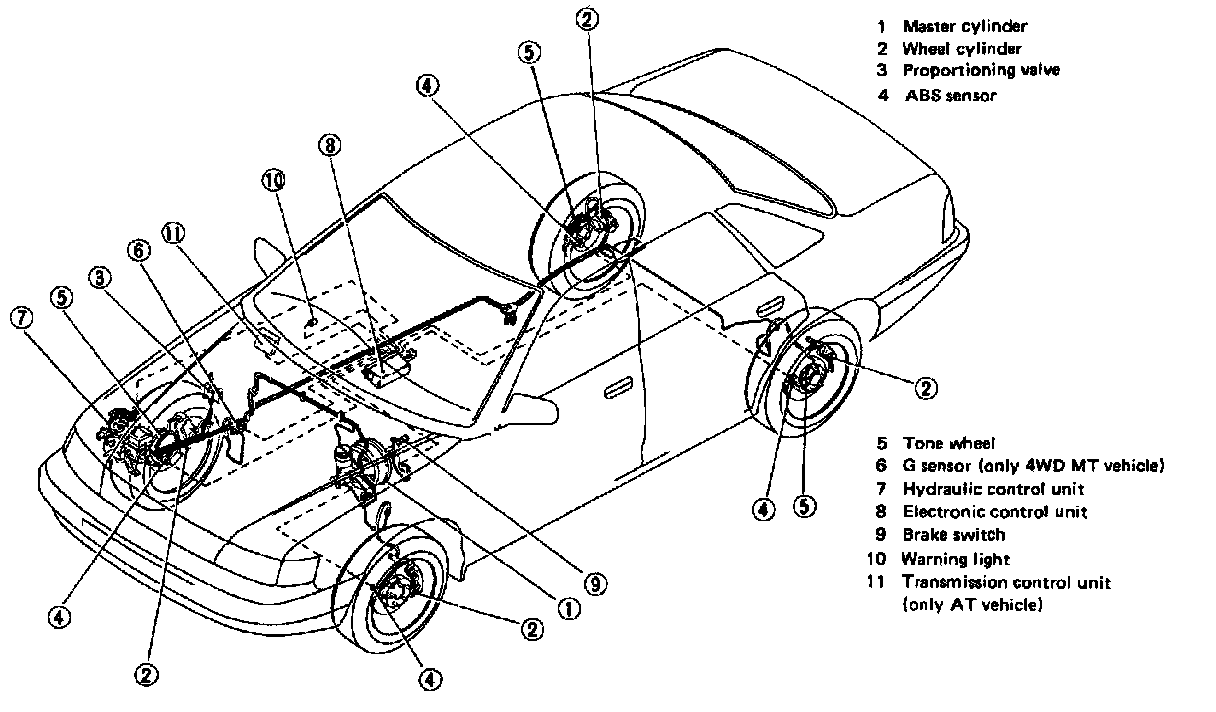 The ABS consists of four tone wheels (5), four ABS sensors (4) , an electronic control unit (8), a hydraulic control unit (7), a G sensor (6) and a warning light (10).