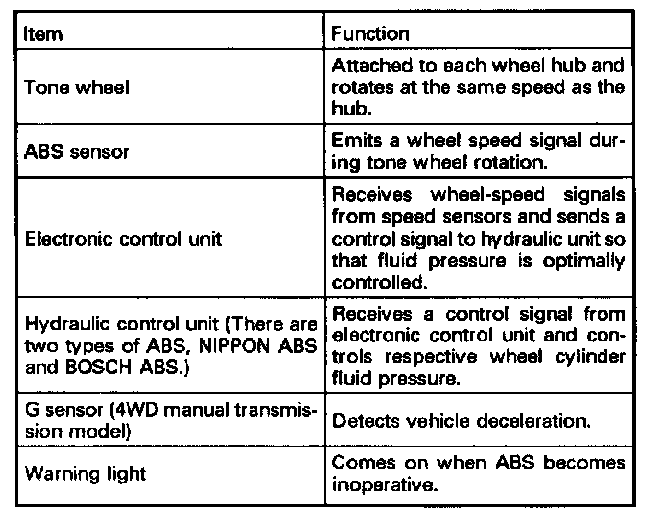 There are two types of hydraulic control unit. One is manufactured by NIPPON ABS under license from ROBERT BOSCH, and the other is manufactured by ROBERT BOSCH. Both hydraulic control units are very similar to each other. The BOSCH type hydraulic control unit does not have the F-valve but has brake pedal "kick back" instead.