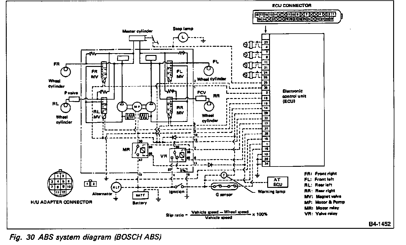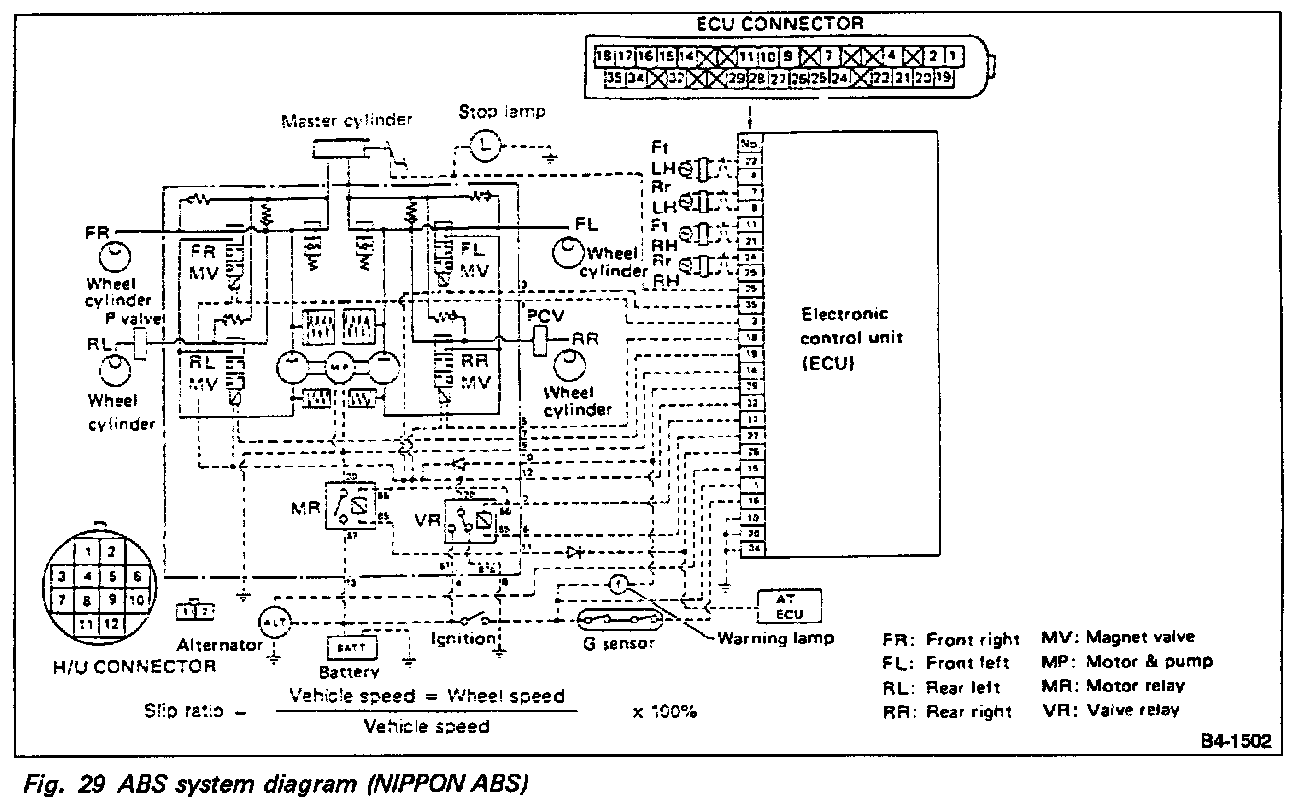 When the brake pedal is depressed during operation, wheel speed as well as vehicle speed decreases. The difference which occurs between wheel speed and vehicle speed is called the "slip" phenomenon. The magnitude of this action is expressed by "slip" the ratio which is determined by the following equation: