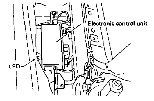 The memory circuit, which serves to memorize system failure, and monitor the regulated power circuit and others, is housed in a separate IC. When the E.C.U. power is applied with the ignition switch "ON" the safety circuit begins to monitor electronic circuits, sensors, the hydraulic control unit, etc. If any circuits or units malfunction, a warning light (dual circuit design) comes on to warn the driver of a problem. The LED in the ECU illuminates to show a trouble code. The brake system then functions as a conventional brake system in place of the ABS.