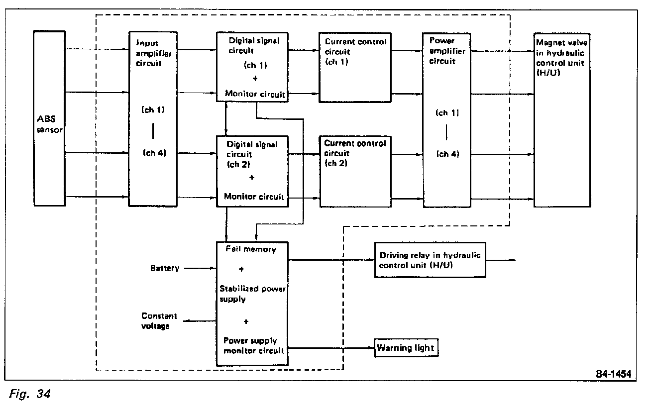 Figure 34 shows a block diagram of the electronic circuits. When the ABS sensor sends an alternating voltage corresponding with the wheel speed to the input amplifier circuit, the signal voltage is converted into a rectangular wave which is sent to the digital signal generating circuit. (This circuit receives two channels of signal at a time.)