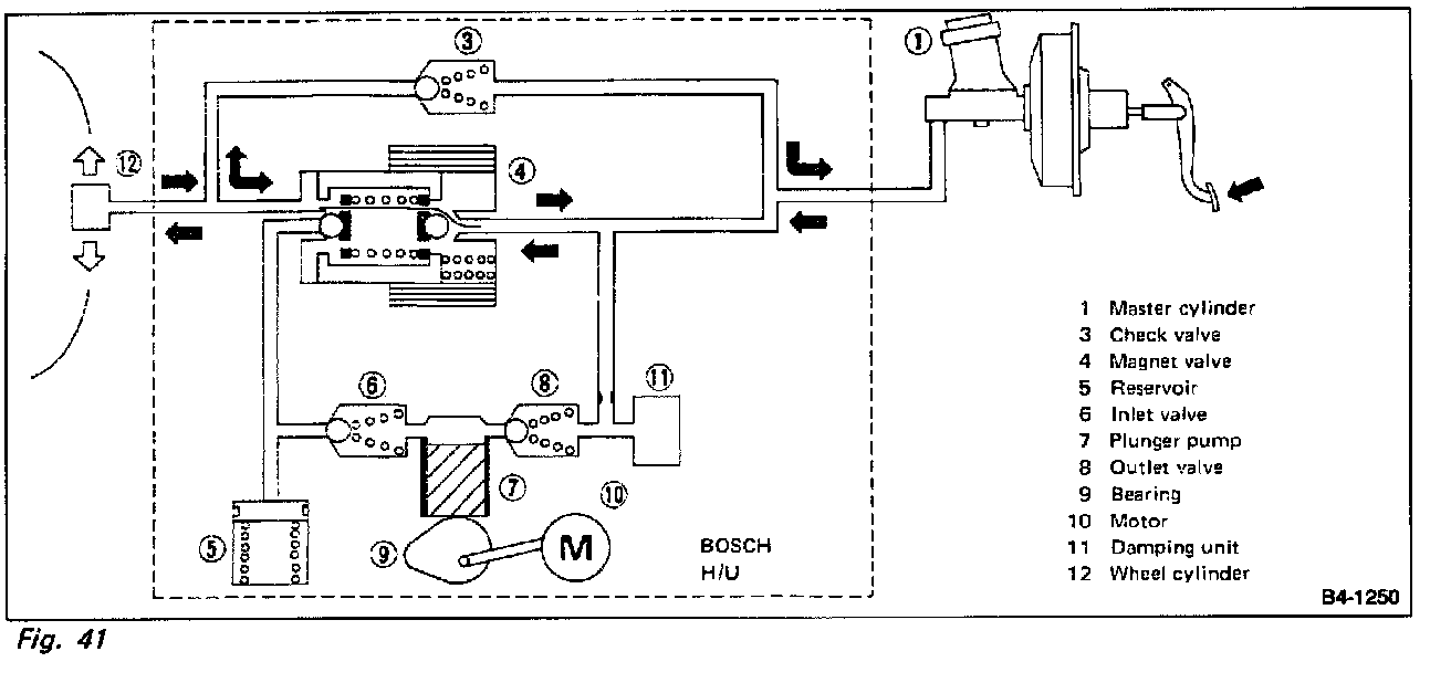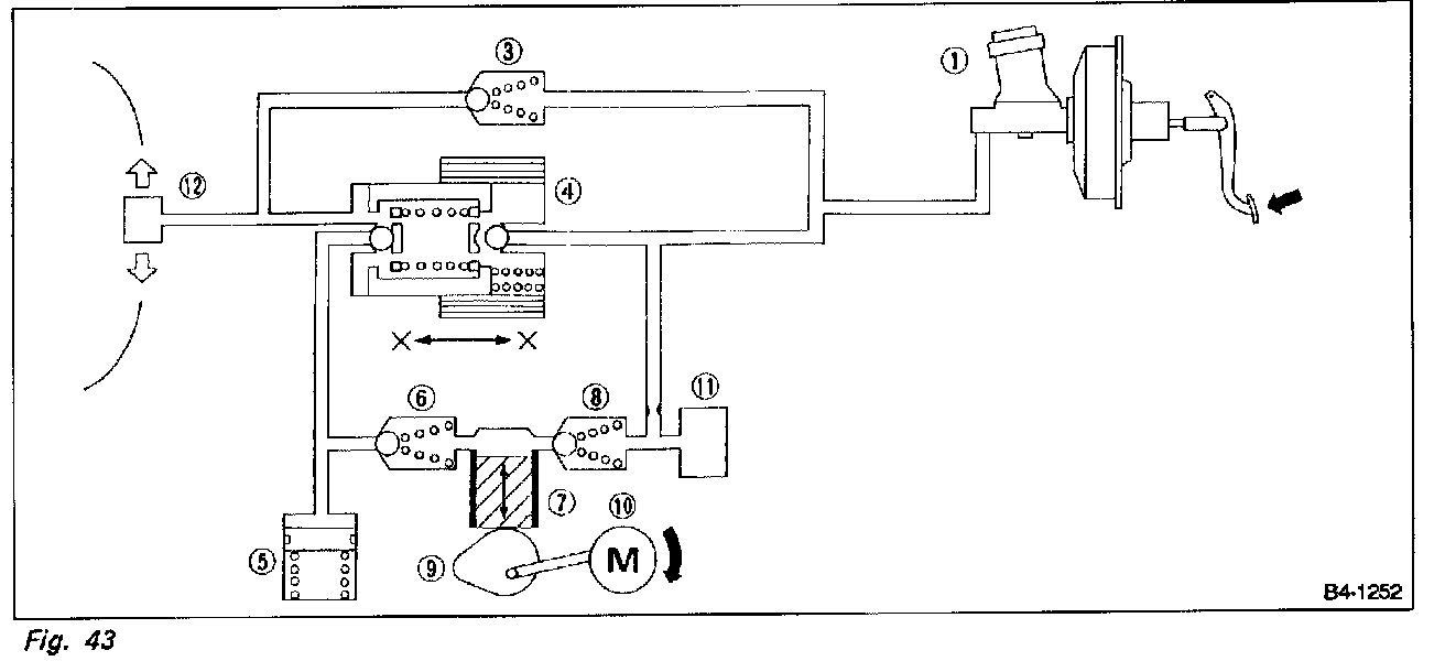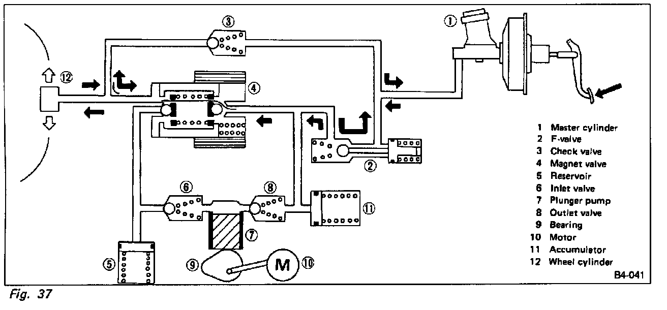 Pressure-decrease action with ABS in operation. When the wheels begin to lock during brake operation, the E.C.U. emits an instruction so that a current of 4.8 to 6 amperes flows through magnet valve (4). This operation closes the inlet port of the magnet valve (4) and opens the outlet port so that wheel cylinder (12) pressure is delivered to reservoir (5) via the outlet port. Brake fluid pressure delivered to reservoir (5) then passes through inlet valve (6) and is increased by plunger pump (7). This causes"kick back" of the brake pedal. Damping unit (11) reduces the pulse flow caused by plunger pump (7). The fluid pressure in wheel cylinder (12) is shut off from the fluid pressure in master cylinder (1) by means of check valve (3). This prevents master cylinder pressure from flowing into the wheel cylinder. Wheel cylinder (12) fluid pressure will then decrease to prevent the wheel lock.