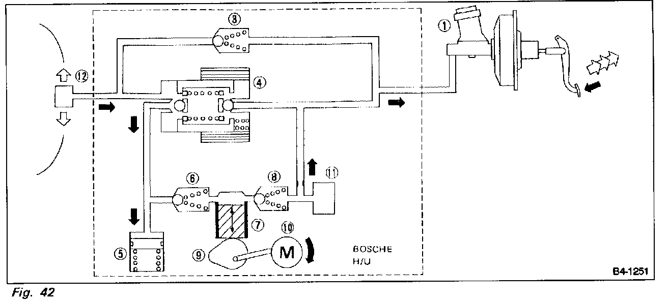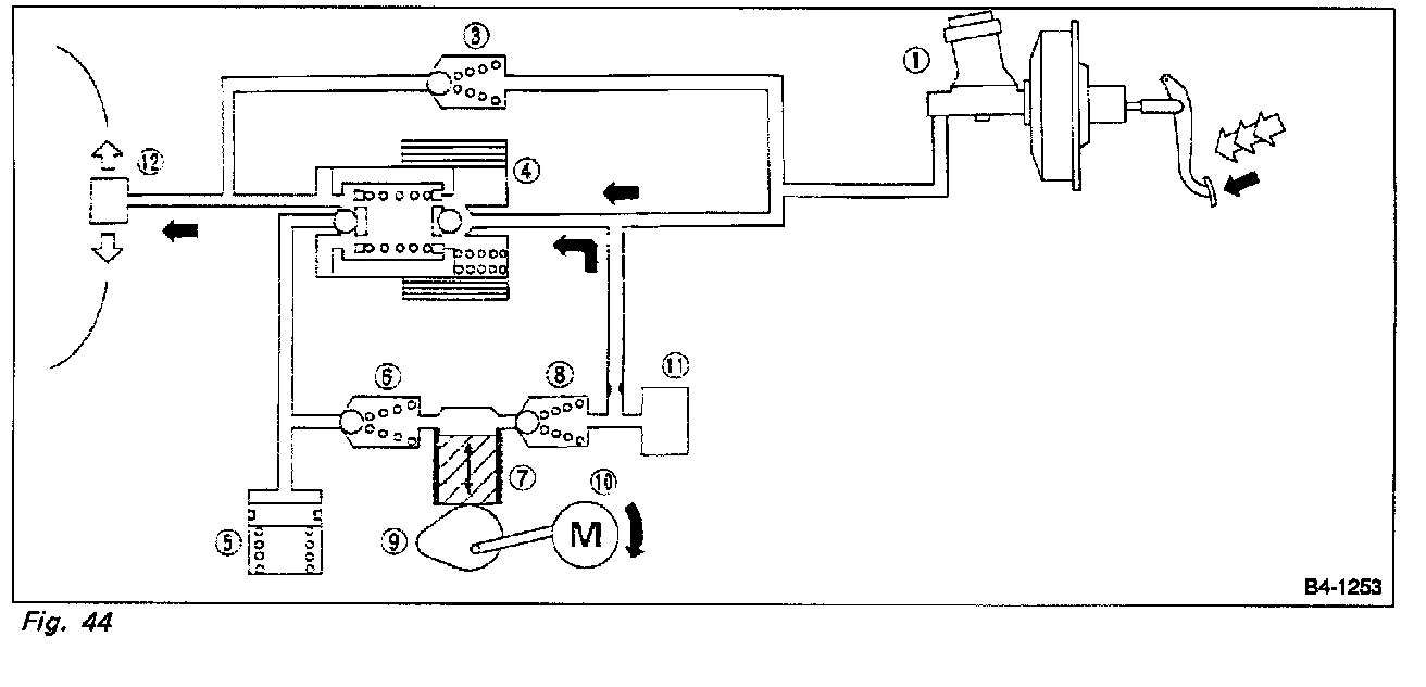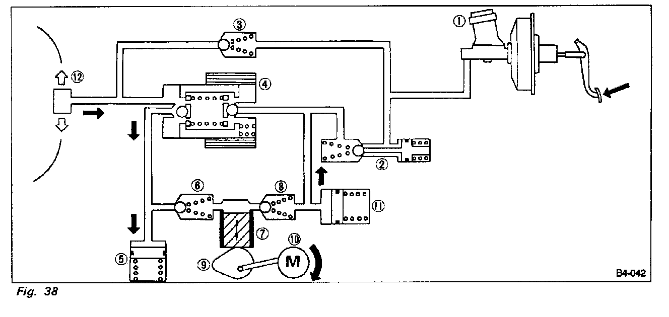 This closes the inlet port of the magnet valve (4) and opens the outlet port so that wheel cylinder (12) pressure is delivered to reservoir (5) via the outlet port. Since current also flows through the motor (10) (simultaneously when the current flows through the magnet valve), motor (10) will start to activate the plunger pump (7) via the bearing (9), provided with an eccentric cam, connected to it. Brake fluid pressure delivered to reservoir (5) then passes through inlet valve (6) and is increased by plunger pump (7). Increased brake fluid then passes through inlet valve (6) and is stored in accumulator (11). At this point, the increased brake fluid pressure is sealed by the ball of valve F (2) to shutout the fluid pressure in master cylinder (1): Fluid pressure in wheel cylinder (12) also shuts out the fluid pressure in the master cylinder (1) by means of check valve (3).