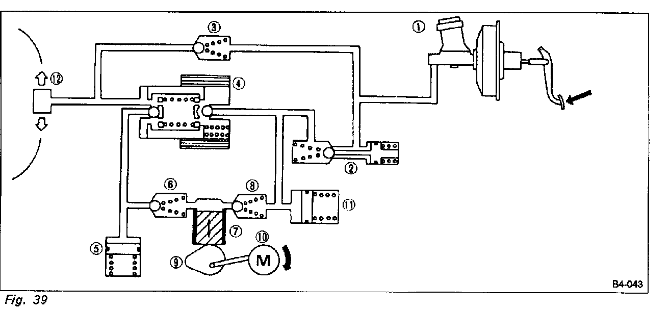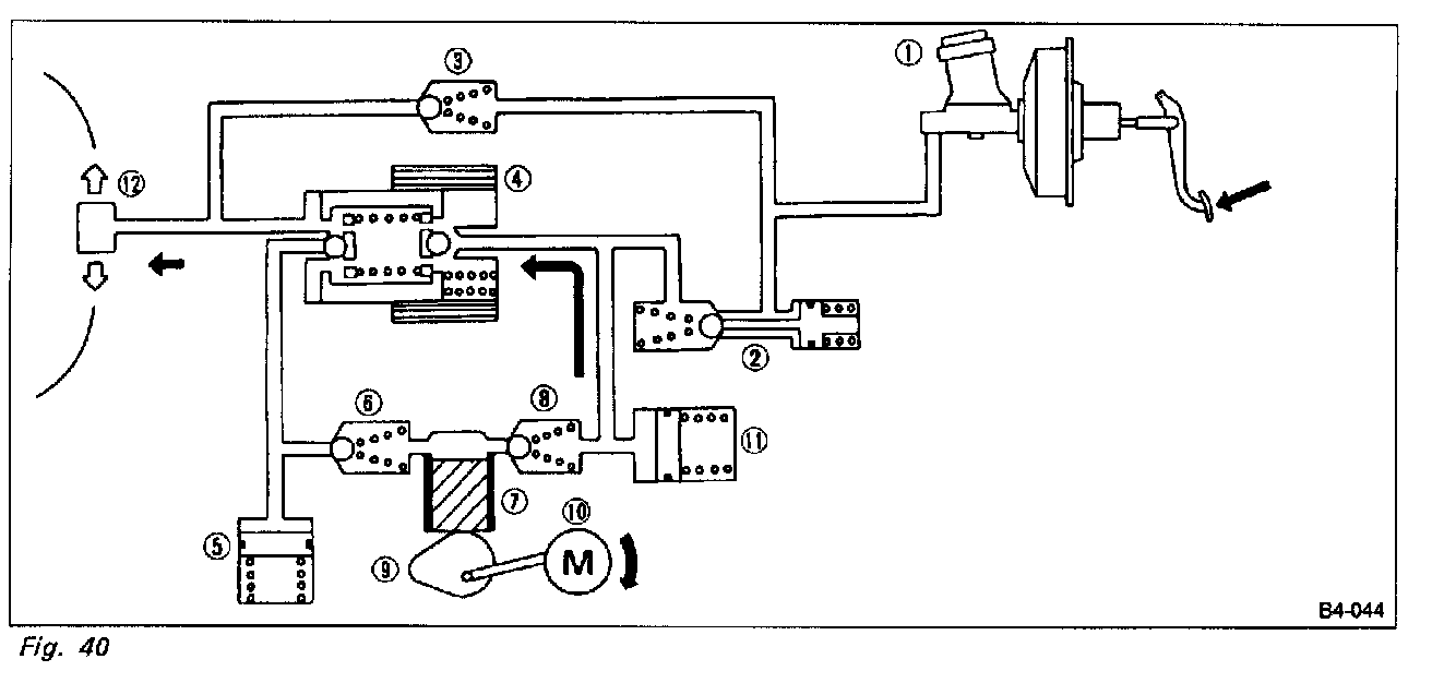 However, when master cylinder (1) pressure drops below approximately 981 kPa (10 kg/cm2, 142 psi), the F-valve (2) return spring is moved to the left to push the ball up. This allows a slight amount of residual pressure - applied to check valve (3) - to be delivered to wheel cylinder (12) via magnet valve (4) .