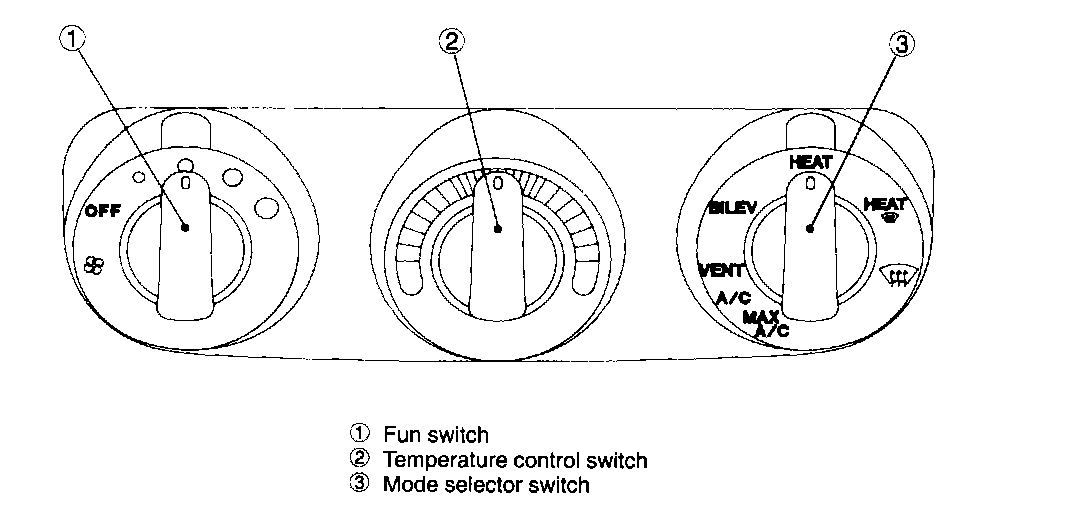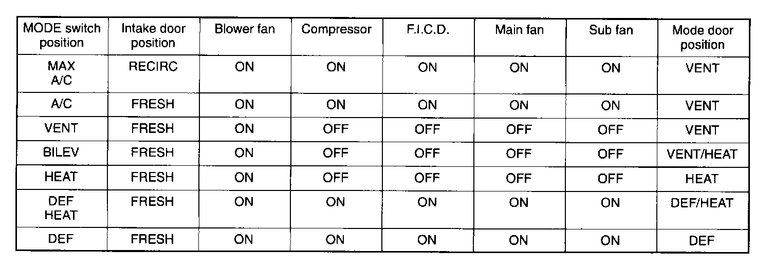 1. When MODE selector switch is set to "MAX A/C", "A/C", "DEF/HEAT" or "DEF", air conditioning system relay activates to enter a signal into engine control unit. This turns on both compressor clutch and F.I.C.D. (Fast Idle Control Device). At this point, the main and sub fans also operate.