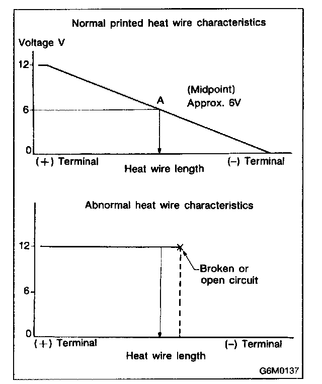 4. When tester indicates 12 volts when its probe reaches point "A", a broken circuit occurs between point "A" and the negative terminal. Slowly move tester probe toward the negative terminal while contacting it on heat wire to locate point where tester indication changes abruptly (0 volts). This is the point where a broken circuit occurs.