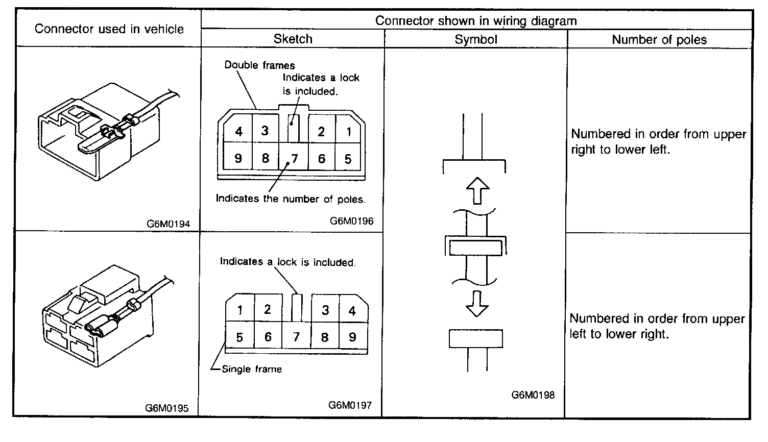 - The number of poles or pins, presence of a lock, and pin number of each terminal are indicated in the sketch of each connector. In the sketch, the highest pole number refers to the number of poles which the connector has. For example, the sketch of the connector shown in figure indicates the connector has 9 poles.