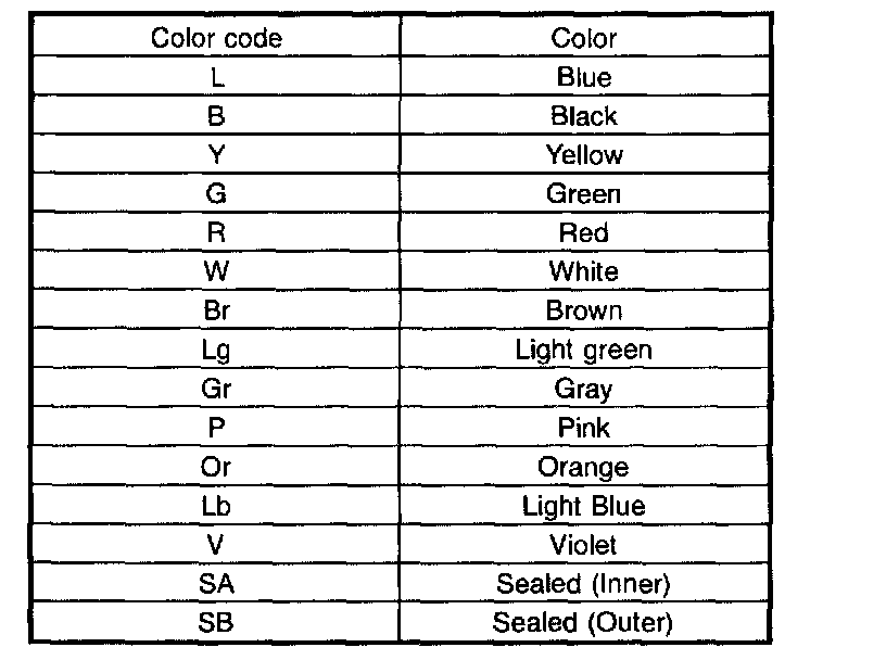 - The wire color code, which consists of two letters (or three letters including Br or Lg), indicates the standard color (base color of the wire covering) by its first letter and the stripe marking by its second letter.