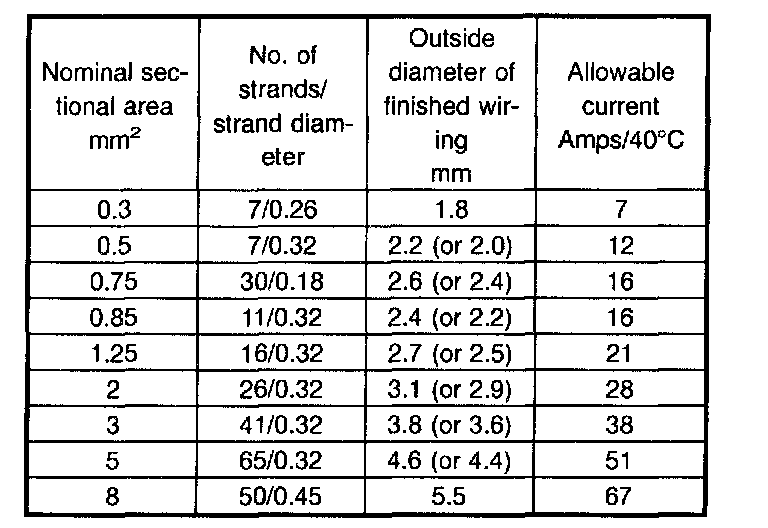 - The table lists the nominal sectional areas and allowable currents of the wires.