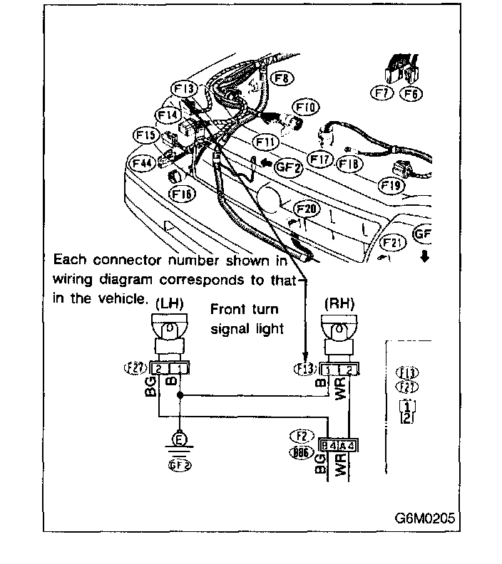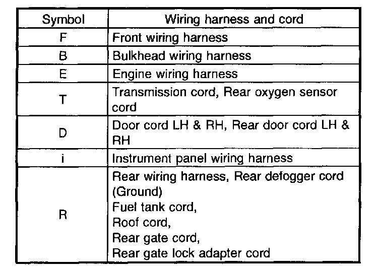 - Each connector number shown in the wiring diagram corresponds to that in the wiring harness. The location of each connector in the actual vehicle is determined by reading the first character of the connector (for example, a "F" for F8, "i" for i16, etc.) and the type of wiring harness.