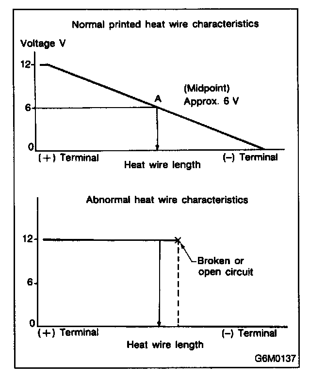 4. When tester indicates 12 volts when its probe reaches point "A" a broken circuit occurs between point "A" and the negative terminal. Slowly move tester probe toward the negative terminal while contacting it on heat wire to locate point where tester indication changes abruptly (0 volts). This is the point where a broken circuit occurs. When tester indicates 0 volts when its probe reaches point "A", a broken circuit occurs between point "A" and the positive terminal. Locate a point where tester indication changes abruptly (12 volts) while slowly moving tester probe toward the positive terminal.